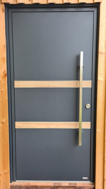 Porte d’entrée sur-mesure en aluminium alliant esthétique, sécurité et performance. Le chantier s'est déroulé à Wettolsheim.
